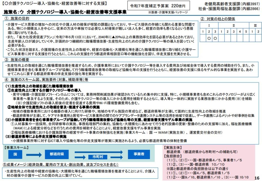 - 施策名:介護テクノロジー導入・協働化・経営改善等支援事業